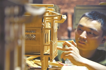 黄俊在师父万桃元的教授下,将土家族吊脚楼按照比例缩小,并按照吊脚楼营造技艺制作吊脚楼模型。