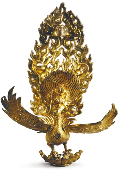 此尊金翅鸟通高18.5厘米,1978年在大理崇圣寺三塔主塔塔顶发现,银质且通体鎏金,体态雄健圆浑,呈展翅飞翔状,头顶饰有美丽的羽冠,尾羽呈火焰状向上展开,镶嵌5颗水晶珠加以点缀,足踏莲座之上,造型独特,精致华美。