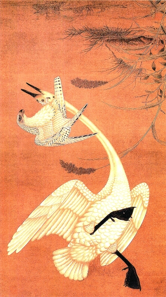 明殷偕绘《鹰击天鹅图》,天鹅即大型候鸟黄鹄(南京博物院藏品)。