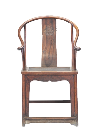 如图1的黄花梨如意卷草纹圈椅,以三木相接成“U”字的圆形椅圈,顺势而下至扶手处向外翻卷。扶手与鹅脖夹角处,有云纹托角牙。靠背板是一块整料,它根据人体脊背的自然曲线设计成“S”形。背板上浮雕如意卷草纹。座面四角攒边框,中间镶席心。面下为壸(kǔn)门式券口牙板。四腿带侧脚收分,之间有步步高管脚枨(chéng)。椅圈、靠背、券口牙子等,流线形的线条及整体的造型,都给人简洁而优美的感受。