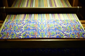 在中国丝绸博物馆的织造馆里,博物馆技术部研究馆员罗群手持梭子,脚踩踏板,正在一台“滑框式一勾多综提花机”上织造“五星锦”。复制的“五星锦”幅宽48厘米,已经织出21厘米的长度。