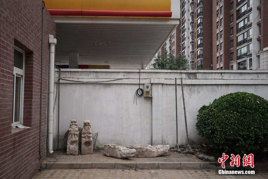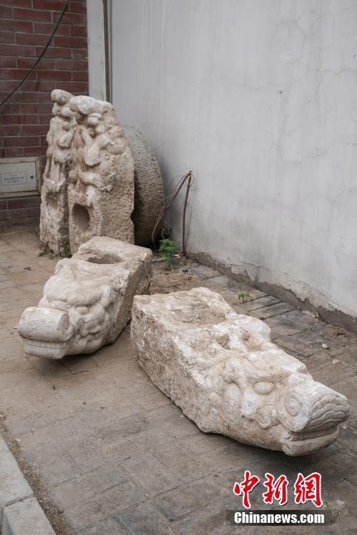 6月12日,4件汉白玉螭头由北京市海淀区清河街道办事处启程回归圆明园。这4件螭头是市民于2017年在北京清河一处工地发现的,后转交至清河街道办事处。近日,经圆明园鉴定,确定此4件石制构件为圆明园流散文物汉白玉螭头。据悉,自圆明园流散文物征集活动开展以来,园方共收回流散文物40余件。图为汉白玉螭头被放置在清河街道办事处等待搬运。中新社记者 崔楠 摄