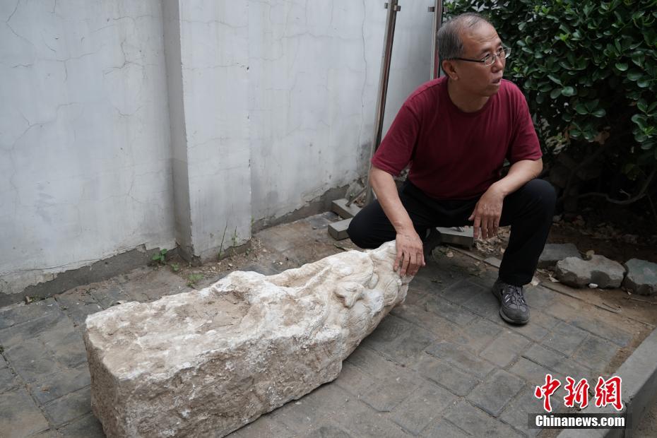 6月12日,4件汉白玉螭头由北京市海淀区清河街道办事处启程回归圆明园。这4件螭头是市民于2017年在北京清河一处工地发现的,后转交至清河街道办事处。近日,经圆明园鉴定,确定此4件石制构件为圆明园流散文物汉白玉螭头。据悉,自圆明园流散文物征集活动开展以来,园方共收回流散文物40余件。图为发现螭头的北京市民杜泽宁讲述发现经过。中新社记者 崔楠 摄