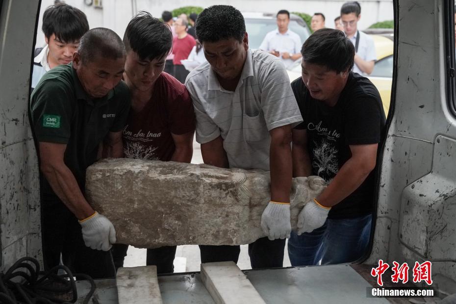 6月12日,4件汉白玉螭头由北京市海淀区清河街道办事处启程回归圆明园。这4件螭头是市民于2017年在北京清河一处工地发现的,后转交至清河街道办事处。近日,经圆明园鉴定,确定此4件石制构件为圆明园流散文物汉白玉螭头。据悉,自圆明园流散文物征集活动开展以来,园方共收回流散文物40余件。中新社记者 崔楠 摄