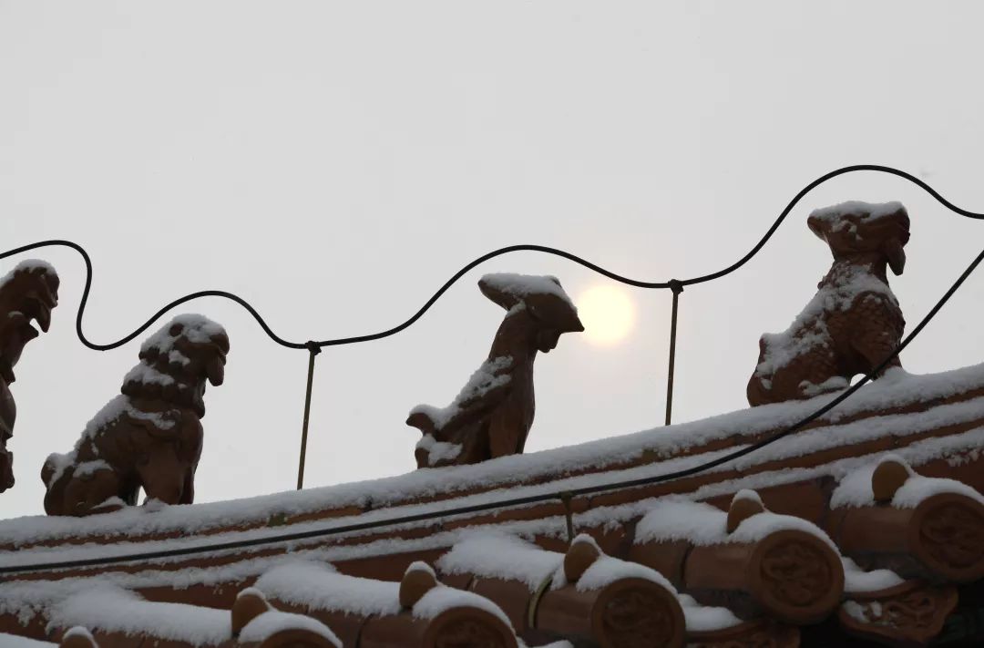 走兽也称蹲兽、跑兽、小跑,是装饰在垂脊或戗脊上的一排小兽的总称。古人为了防止屋脊上的屋瓦脱落,会在瓦片之间钉入铁钉,这些形状各异的走兽就是由铁钉的顶帽演变而来的。