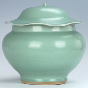 南宋龙泉窑青釉荷叶形盖瓷罐。
