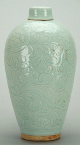 南宋景德镇窑青白釉刻划缠枝花卉纹大瓷梅瓶。