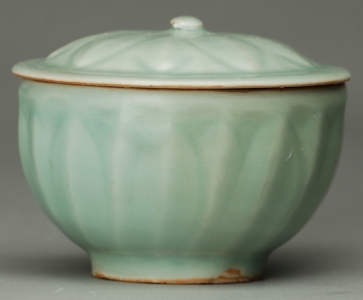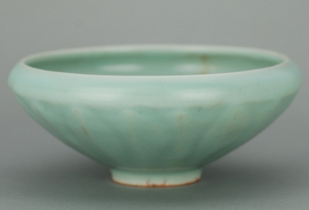 青釉刻花莲瓣敛口斜腹瓷碗。