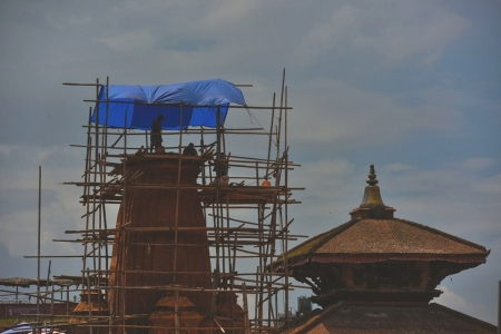8月9日,尼泊尔巴德岗,当地工程人员正在对一栋建筑进行维修。