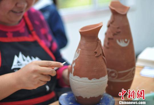 图为陶艺师使用马家窑纹样制作现代陶艺。 崔琳 摄
