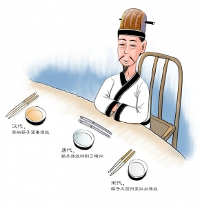 “在一些四川出土的汉代画像砖上,经常可以见到宴饮场景,宴饮者席地而坐,面前摆着方形或圆形食案,案上有筷子和其他餐具。这些筷子都是纵向摆放在食者面前,似乎没有例外。”王仁湘说,可汉代以后,情形开始有了改变,筷子出现在餐桌上时,由纵向转到了横向,晋唐就是这样的。到了五代至宋时,筷子又回归至纵向姿态了。