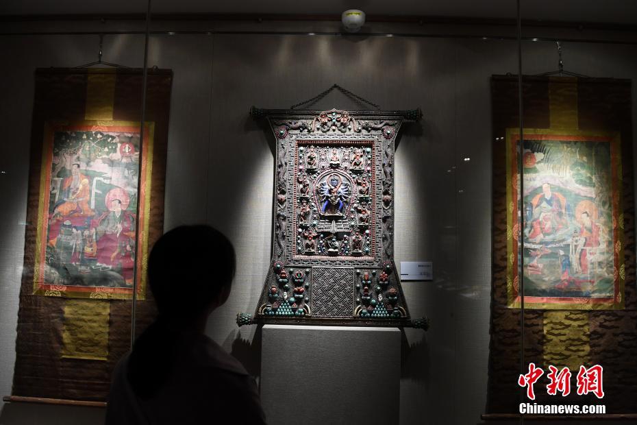 11月13日,掐丝宝石唐卡亮相兰州天庆博物馆吸引参观者。宝石唐卡采用掐丝工艺,并嵌有绿松石、青金石、红珊瑚等名贵宝石,较之常见的布本唐卡制作工艺更为复杂,制作成本亦更昂贵。 中新社记者 杨艳敏 摄