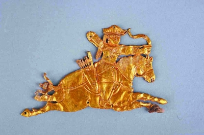都兰出土的骑射形金饰片,制作新奇,表现出令人惊讶的手工业的发达程度,充分反映青海农牧交错、民族融合的特点。武士形象威猛,策马飞奔,满弓拉弦,头戴山形冠饰,两根辫子垂于脑后,八字须,大耳坠,窄袖对襟翻领连珠纹图案服饰,革带上佩带箭箙(箭袋)佩剑,脚着皮靴、马鞍、马镫、马具刻画清晰。