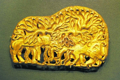金牌是匈奴文化的典型之物,用于系挂,多以我国北方的动物为题材。作为本次展览中的流量担当,重365克的国宝级文物狼噬牛金牌饰,透雕出在茂密的灌木林里,狼偷袭牛的瞬间情景:浓密枝叶的掩映下,一头缓步穿行的牛,忽然被藏匿于枝叶后的一只狼噬咬住后腿,毫无防备的牛前腿弯曲,低首做挣扎状。整个画面表现出了狼的狡诈和牛的无奈。牌饰层次丰富,线条流动,是草原的生存法则和自然界弱肉强食的真实写照。