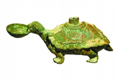 砚滴,是一种文房器物,贮存砚水供磨墨之用。魏晋时期的铜铸玄武砚滴,龟蛇合体。龟首前伸,双目圆睁,口衔一浅腹小碗。长蛇曲卧龟背,蛇头曲伏在龟颈右侧,花纹呈点状分布于蛇身。龟腹中空,龟背中央有一管状孔直通龟腹,为注水口。这件器物设计精巧,融艺术性与实用性于一身,让人啧啧称奇。