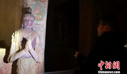 莫高窟“巡诊医生”拿着手电筒仔细查看佛像。 南如卓玛 摄