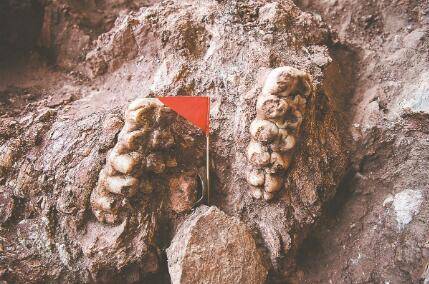 在人字洞遗址西裂隙缝考古发掘发现的一具成年个体乳齿象的臼齿化石。