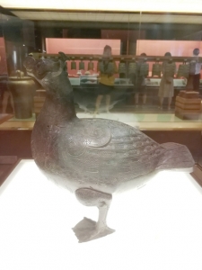 并不是所有的动物尊都能装酒,比如三峡博物馆的镇馆之宝之一,鸟形尊。它于2002年出土于涪陵小田溪墓地,是战国时期的青铜器。此尊整体呈鸟形,活灵活现,具有鱼嘴、鹰喙鼻、兽耳、凤冠、鸽身、鸭脚。全身雕刻有细密的羽纹,并镶嵌绿松石,十分精美耐看。青铜器中的尊本是酒器,但奇怪的是,这件鸟形尊除嘴外,无一孔,不具备容器的实用性。但其体轻,壁薄,中空,铸造难度极高,令人匪夷所思。这款尊也展现了巴人丰富的审美情趣、精妙的工艺水平和高超的铸造技术,堪称艺术精品。