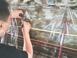 工作人员正在给七佛宝殿明间脊檩彩画拓“谱子”。