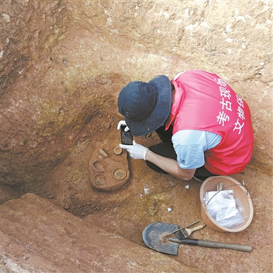 昨日,记者赶到现场时,见到考古队员正在一座墓坑底部清理发现的文物(如右图)。这是一件青铜刮刀,一件青铜斧。考古人员介绍,青铜器出土后,如果直接清理出来就运走,表面的铜锈等就会散落,“一路走一路散”,造成文物信息的损失。所以他们是先用宣纸,再用保鲜膜将发现的铜器和包着铜器的一团土一起包起来,外面再用石膏固定。石膏外壳上做好标记,送回文物考古研究院的实验室中再慢慢处理。