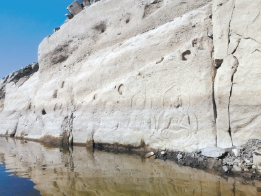 随着水位下降,延庆区白河堡水库内三座连排摩崖石刻渐渐露出水面。这是水库蓄水36年来石刻首次“现身”,当地文物部门根据石刻像的服饰、雕刻风格初步推断,石刻可能为元明时期。