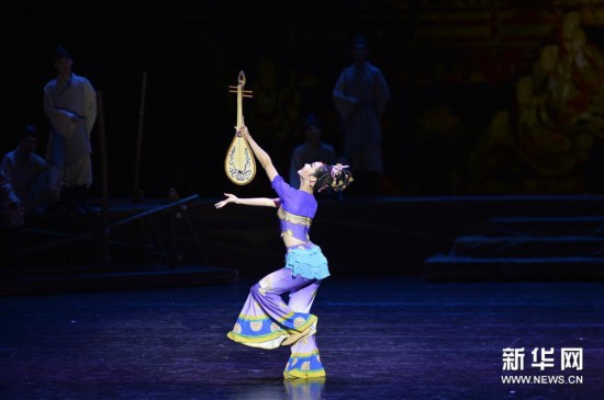 演员在敦煌大剧院表演2018版《丝路花雨》(4月30日摄)。 4月30日,2018版大型舞剧《丝路花雨》在敦煌大剧院举行全球首演。《丝路花雨》取材于敦煌莫高窟壁画艺术,描述了画工神笔张和歌伎英娘的悲欢离合以及与波斯商人伊努斯之间的纯洁友谊。新华社发(李笑 摄)