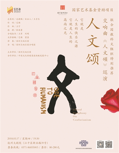 5月17日,国家艺术基金2017交流传播推广项目交响曲《人文颂》将亮相杭州大剧院。届时,在著名指挥家张国勇和青年指挥家林大叶带领下,深圳交响乐团和深圳交响乐团合唱团将向江苏和浙江的观众倾力奉献,奏响金石之声,带领观众在行云流水、大气恢弘的音乐声中聆赏儒家思想的深邃、博大与美好。