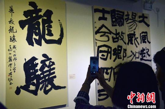 图为一名观众在用手机拍摄书法展览作品。 孙亭文 摄