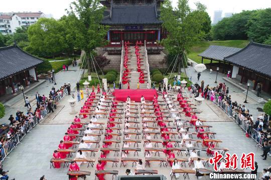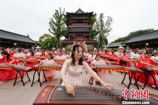 5月20日是中国古筝日,当日,数百名古筝爱好者在泰州望海楼广场古同时弹奏《渔舟唱晚》。