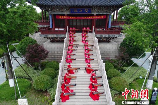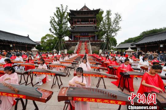 图为数百名古筝爱好者在泰州望海楼广场古同时弹奏《渔舟唱晚》。 汤德宏 摄