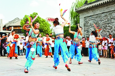 6月9日,在山东枣庄台儿庄古城,民间艺人在为游人表演京西太平鼓。新华社发
