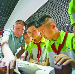 6月8日下午,浙江省湖州市南浔区双林镇绫绢传承馆内,国家级非遗项目“双林绫绢织造技艺”传承人郑小华正在手把手向孩子们传授绫绢织造技艺。王嘉斌摄/光明图片