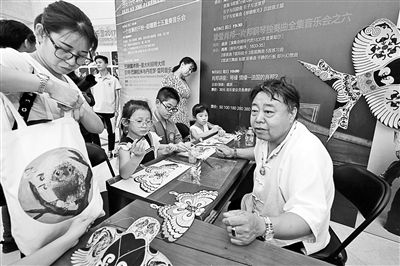 一名小学三年级的女孩昨天傍晚早早来到中山公园音乐堂,这里将举行“八喜·打开艺术之门——2018暑期艺术节”的开幕演出。在北京交响乐团的音乐会之前,非遗传承人“北京鬃人”代表性传承人白霖、孙氏剪纸第四代传人王磊、风筝制作技艺东城区代表性传承人杨利平、“北京面人”传承人张宝林在音乐堂大堂摆起摊位。小女孩手拿画笔,在杨利平指导下认真地画起风筝。