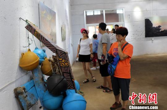 目前,馆内展出的艺术作品大多取材于海岛风景、物产等,一些工艺品还来自老旧渔业物资,如废弃的船械浮漂和渔笼绳缆等。
