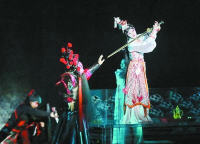 一边是霸王唱着“虽英勇怎提防十面埋藏”,一边是被舞蹈演员簇拥着的虞姬,伴奏乐队不时奏出几声时尚风格的打击乐声——这样的《霸王别姬》,着实惊艳。