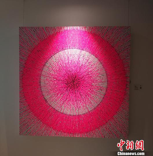 “这幅作品是‘中国85美术新潮第一人’孟禄丁的作品《元速》,孟禄丁是中国抽象艺术的主要代表人物之一。”此次大展策展人张桨在展览现场介绍,孟禄丁的“元速”系列作品,带有很强的未来主义风格特征。描述的是无限的时间、空间,是宇宙的起源,是元初。“元速”系列是通过一种抽象的语言,体现跟人体有关的原初的生命状态。这些放射性的图像中,涌动着生命的张力与释放,趋向于自由。