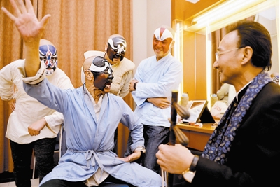 上图 演出前康万生(左二)与琴师吕玉勇为三名弟子做示范,演唱《打龙袍》选段。 本报记者 庞剑摄