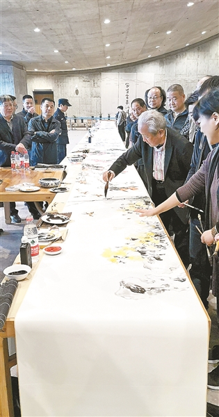 开幕式后,两地书画家尽情挥毫泼墨,携手同绘“浙水蜀山·大美中国”书画长卷,现场气氛十分热烈。来自成都的美术家刘正兴、姚叶红、陈志才、胡真来、闫明海、李显波,书法家赵安如、钟杨琴笙、汤文俊、郭彦飞,与来自杭州和富阳的美术家杜高杰、张子翔、缪宏波、吴洪晖、蔡明、骆松涛,书法家王冬龄、宋涛、王小勇、吴新如、蔡云超、王健林一道,以高超的技艺,把浙水蜀山的俊美山河尽收其中。在现场观众的热情注视下,一个多小时后,气势恢宏的25米书画长卷跃然纸上,现场观众和摄影家们,用手中的镜头,记录下了23位艺术家用心用情用功创作的每一个瞬间。
