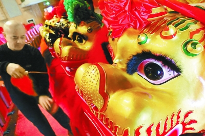 表演前,杨敬伟挨个检查狮头,确保现场表演效果和安全。