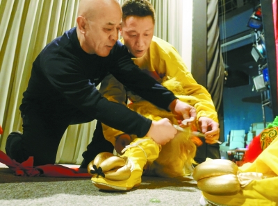 狮爪不能绑得太紧也不能太松,杨敬伟帮队员找感觉。