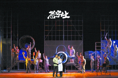 《苍穹之上》的舞台呈现十分丰富,从只能制造“耙耳朵”的工厂,到现代化的制造车间;从简单的脚手架,到震撼人心的战机“鲲鹏2.0”,在小小的舞台上展露无遗。同时,该剧的细节处也经过巧妙设计与安排,如在战机后默默工作的群演,让观众看到了战机制造一线的劳动者兢兢业业工作的情景。此外,剧作场景切换也颇具创意——一名指挥人员吹着嘹亮的哨子指挥若干航空制造工人热火朝天地工作,其实是为接下来的场次更换场景。直到该剧谢幕时,压轴出场的指挥人员也没有一句台词,这名指挥人员与众多默默工作的航空制造工人一起,营造了一种无声胜有声的“留白”,实为暗合剧作平凡者不平凡的主题。