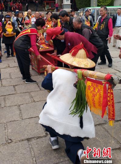 来自台湾的进香团一行一路踩街到祖庙天后宫,并在天后宫广场向妈祖举行团拜仪式,祈求合境平安,万事顺意。队伍里一位头戴斗笠,身披羊毛襖,手提铜锣,肩挑纸伞,伞上挂着生猪蹄、韭菜和酒壶的“报马仔”,其独特的装扮吸引了众多围观者拍照留念。