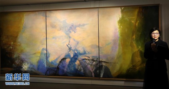 3月25日,在佳士得香港举行的传媒预展上,工作人员在介绍赵无极画作《三联作1987-1988》。 新华社记者 吴晓初 摄