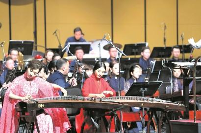 昨晚,上海民族乐团《锦绣中华·最忆是江南》民族管弦乐音乐会在上海大剧院上演。作曲家孔志轩创作的双古筝与乐队作品《山色》,引人入胜。 本报记者 蒋迪雯 摄 ■本报记者 吴桐