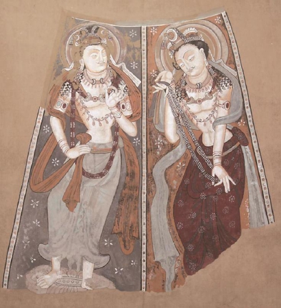 本次展览中还有一个仿真洞窟,是以伎乐壁画而著称的克孜尔石窟第38窟,色彩绚丽,绘画技法精湛。壁画中富丽多姿的乐舞造型与种类丰富的乐器交相辉映,既有产生于中原地区的排箫和阮咸,也可见由西亚、中亚和印度等地传入的箜篌等乐器,见证了丝路乐舞艺术在古龟兹交汇融合的历史。壁画在绘制手法上重视线条造型的运用,敷色上较多使用平涂,都体现出中原绘画艺术的影响。此外,展览还包括部分流失海外的石窟壁画复制品。