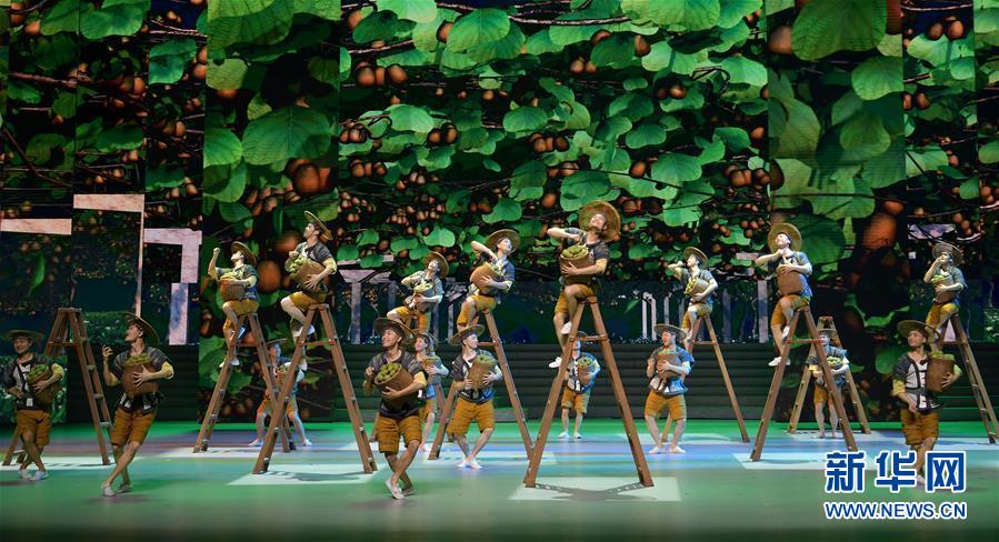 讲述十八洞村精准扶贫故事 歌舞剧《大地颂歌》中表现贫困村村民们采摘猕猴桃的场景。这是彩排照片(11月5日摄)。新华社记者 李贺 摄
