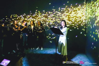 比如,“超越边界”是以声光打造的水世界,其中“水粒子的世界”激起竖琴演奏家陈蕾的兴趣,在这里她演奏了罗尔夫·劳弗兰的《秘密花园》。“光之雕刻”的世界就像一个用灯光制造的小宇宙。上海交响乐团的大提琴首席朱琳和大提琴演奏家陈少俊就在这个小宇宙中,演绎巴赫的无伴奏大提琴组曲,让人们在大提琴的沉吟中感受宇宙的浩渺。单簧管演奏家戴乐和长笛演奏家龚霄云在“蝴蝶小屋”吹响了莫扎特、圣-桑、德彪西及巴赫的作品。小提琴演奏家时震宇则在“生死无止尽”,通过德彪西、维瓦尔蒂、皮亚佐拉、弗兰克等作曲大师的小提琴作品,展示生命的苍茫。同为小提琴演奏家的黄娜在该展览极为代表性的“灯森林”里尽情展示巴赫的深邃思想和丰富情感。