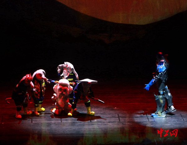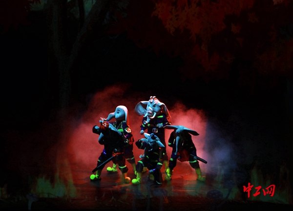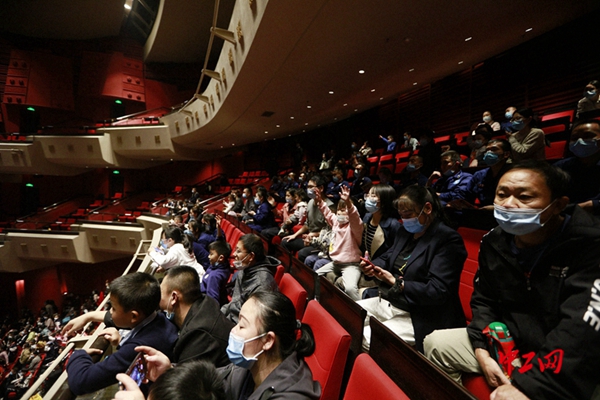 这是11月9日晚在武汉琴台大剧院拍摄的全国首部消防题材音乐儿童剧《大象消防局》上映现场
