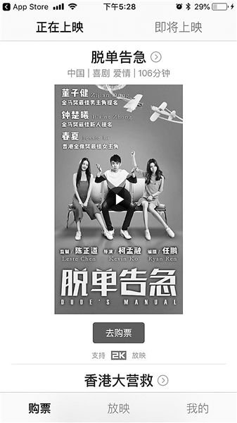 北京青年报记者昨日在“移动电影院”APP上看到,目前正在放映的是《脱单告急》和《香港大营救》,每部售价都是25元。而之前排片中的日本电影《第三度嫌疑人》和“即将上映”的巴西电影《尼斯:疯狂的心》都悄然下线。新上线“即将上映”栏的,是《亲爱的,我要和别人结婚了》——据“中国电影票房吧”15日下午的数据,该片当日全国票房为35万元,两天累计票房为100万元。而且,据了解,这些影片下线的时间也将与院线一致。至于原来所说的“电影解说服务”目前尚未推出。