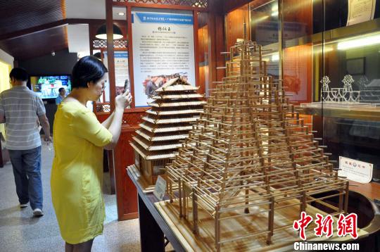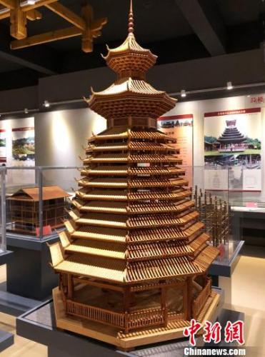 资料图:广西侗族木构建筑营造技艺项目传承人何绍堂制作的鼓楼作品。 融古月 摄